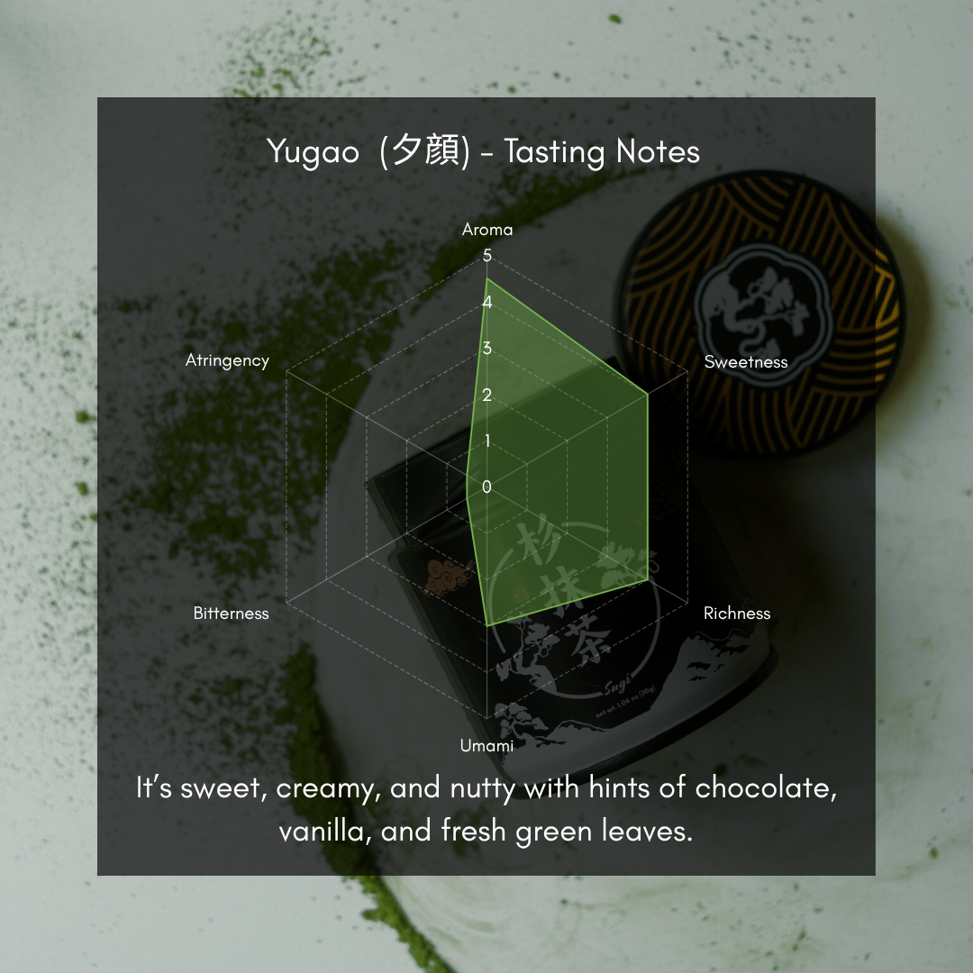 Yugao features a sweet, milky, chocolate-like aroma that softens the naturally fresh, grassy scent of green leaves. It offers a full-bodied mouthfeel with bits of astringency. The taste begins smoothly with nutty notes, followed by a hint of vanilla, and finishes with a lingering creamy, buttery flavor.